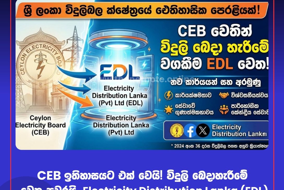 කොළඹ: 2024 අංක 36 දරන ශ්රී ලංකා විදුලිබල පනත මඟින් හඳුන්වා දුන් පුළුල් ප්රතිසංස්කරණ ක්රියාවලියේ සුවිශේෂී පියවරක් ලෙස, මෙතෙක් ලංකා විදුලිබල මණ්ඩලය (CEB) සතුව තිබූ විදුලි බෙදාහැරීමේ සියලු වගකීම් සහ මෙහෙයුම් කටයුතු Electricity Distribution Lanka (Pvt) Ltd (EDL) සමාගම වෙත නිල වශයෙන් පවරා තිබේ.