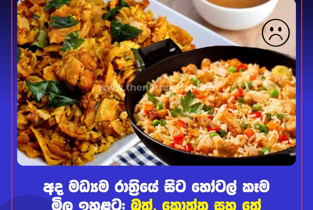 කොළඹ (මාර්තු 11): දිවයින පුරා පවතින ආපනශාලා සහ අවන්හල්වල අලෙවි කරනු ලබන ආහාර පානවල මිල ගණන් අද (11) මධ්යම රාත්රියේ සිට ඉහළ නැංවීමට තීරණය කළ බව සමස්ත ලංකා ආපනශාලා සහ අවන්හල් හිමියන්ගේ සංගමය නිවේදනය කරයි.