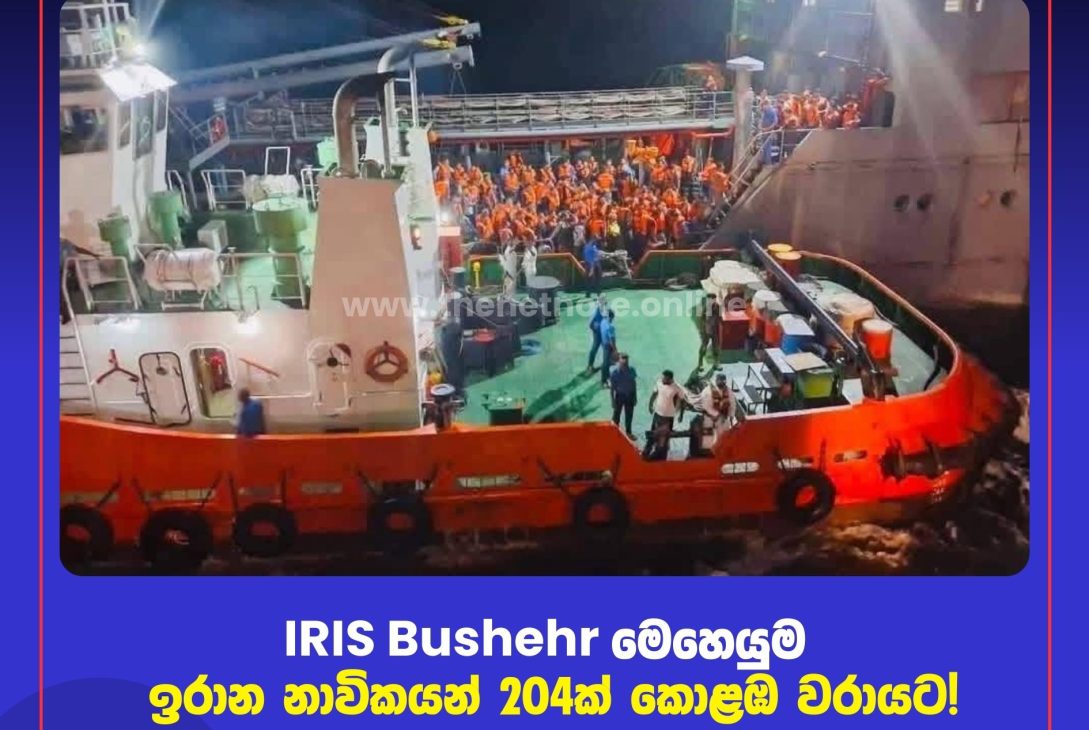 කොළඹ: ශ්රී ලංකා මුහුදු සීමාව ආසන්නයේ නැංගුරම්ලා තිබූ ඉරාන නාවික හමුදාවට අයත් ‘IRIS Bushehr’ නෞකාවේ සිටි කාර්ය මණ්ඩල සාමාජිකයින් 204 දෙනෙකු ආරක්ෂිතව කොළඹ වරාය වෙත රැගෙන ඒමට ශ්රී ලංකා නාවික හමුදාව සමත්ව තිබේ.