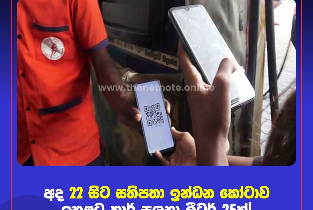 ජාතික ඉන්ධන අවසර පත්රය (National Fuel Pass) යටතේ මෙතෙක් ලබාදුන් සතිපතා ඉන්ධන කෝටාව අද (22) මධ්යම රාත්රියේ සිට ක්රියාත්මක වන පරිදි ඉහළ නැංවීමට ලංකා ඛනිජ තෙල් නීතිගත සංස්ථාව තීරණය කර ඇත.